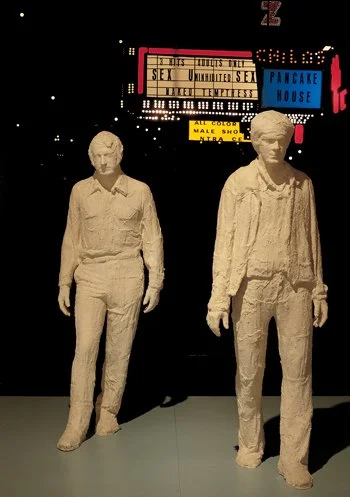 Times Square at Night consists of two sculptured of men walking through a night scene of Time Square, the backdrop illuminated with neon signs for pornographic films and food. The two figures are cast from live models using strips of plaster bandages. Although the sculptures are lifelike, their features are ambiguous, giving them an anonymous quality. Their expressions are blank and downcast, although they are walking through one of the most famous places in America. The advertisements for pornographic films do not leave the two men titillated, in fact, they seem lonely and isolated from one another and the scene around them. Times Square as seen as an epicenter of American culture and excess. It is a huge tourist attraction with every kind of diversion to offer. Segal is showing that these diversions and promises of anonymous sexual thrill do not fulfill the two men, it actually deadens them inside. The viewer gets the sense that the men exist apart from the scene they are inhabiting, walking through it but not experiencing it. The bright lights and constant sensory onslaught have made them apathetic.